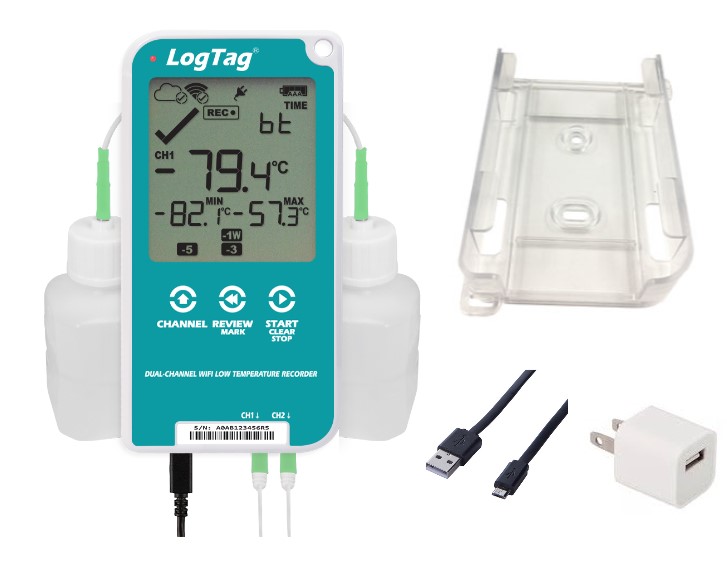 Includes: UTREL30-16 logger, two (2) ST10M-15 external probes, two (2) buffer bottles, wall mount bracket, USB cable, power adapter, calibration certificate.